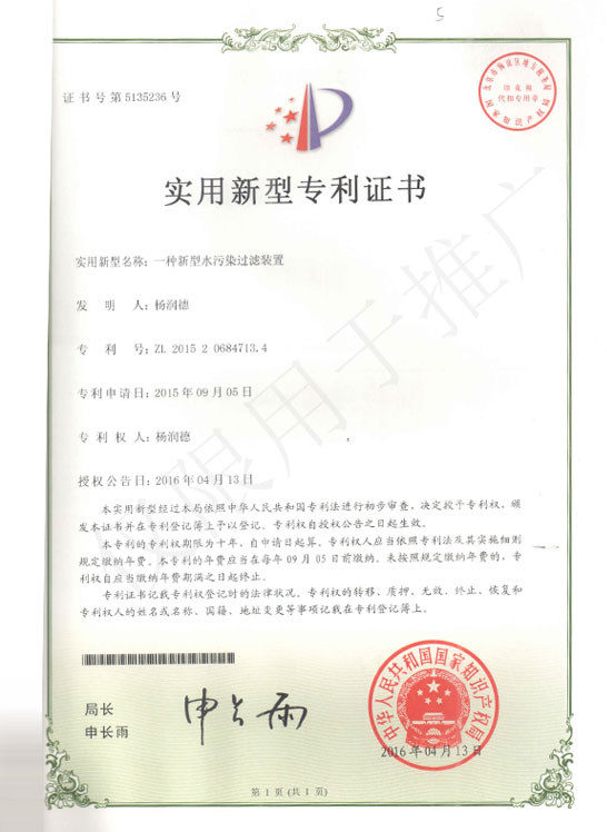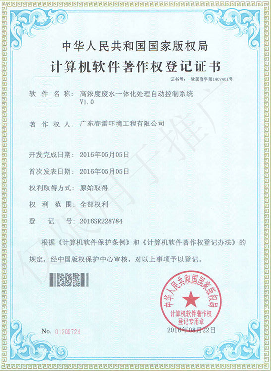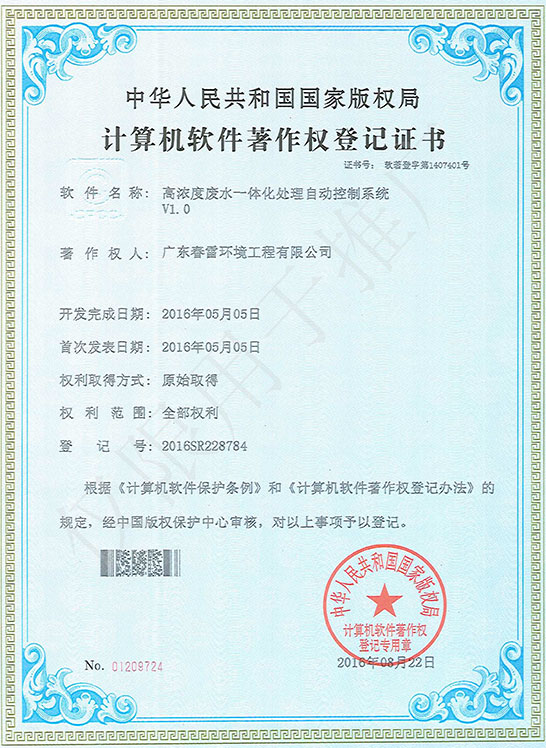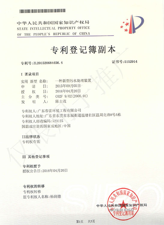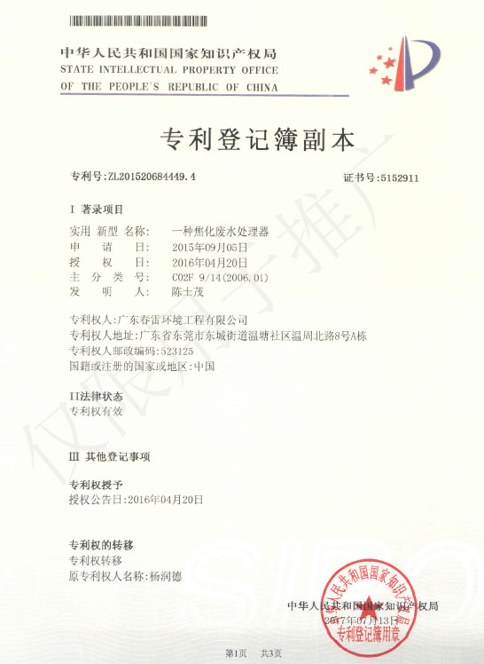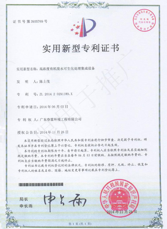 高濃度有機廢水可生化集成處理裝置實用新型專利證書