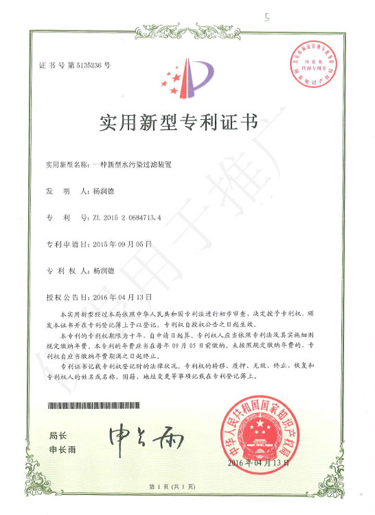 實用新型專利證書-一種新型水汙染過濾裝置