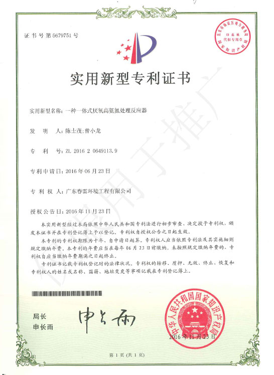 實用新型專利證書-一種一體式厭氧高氨氮處理反應器